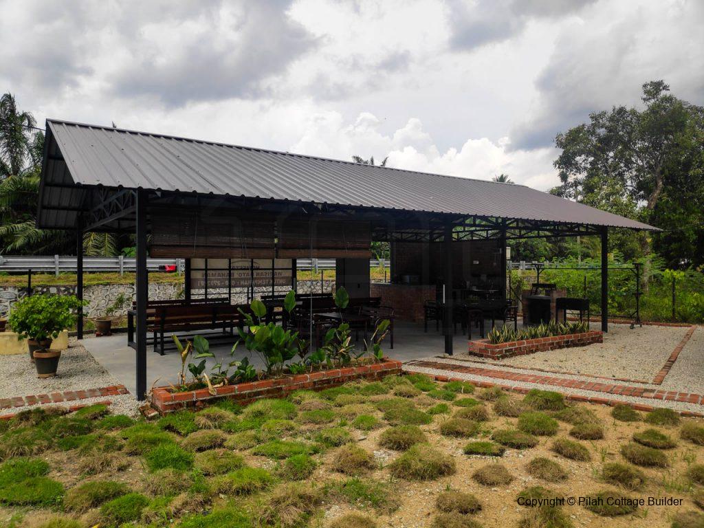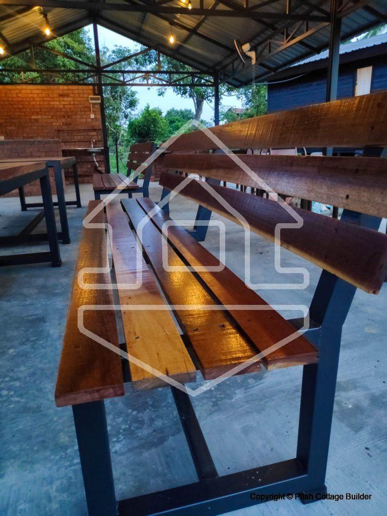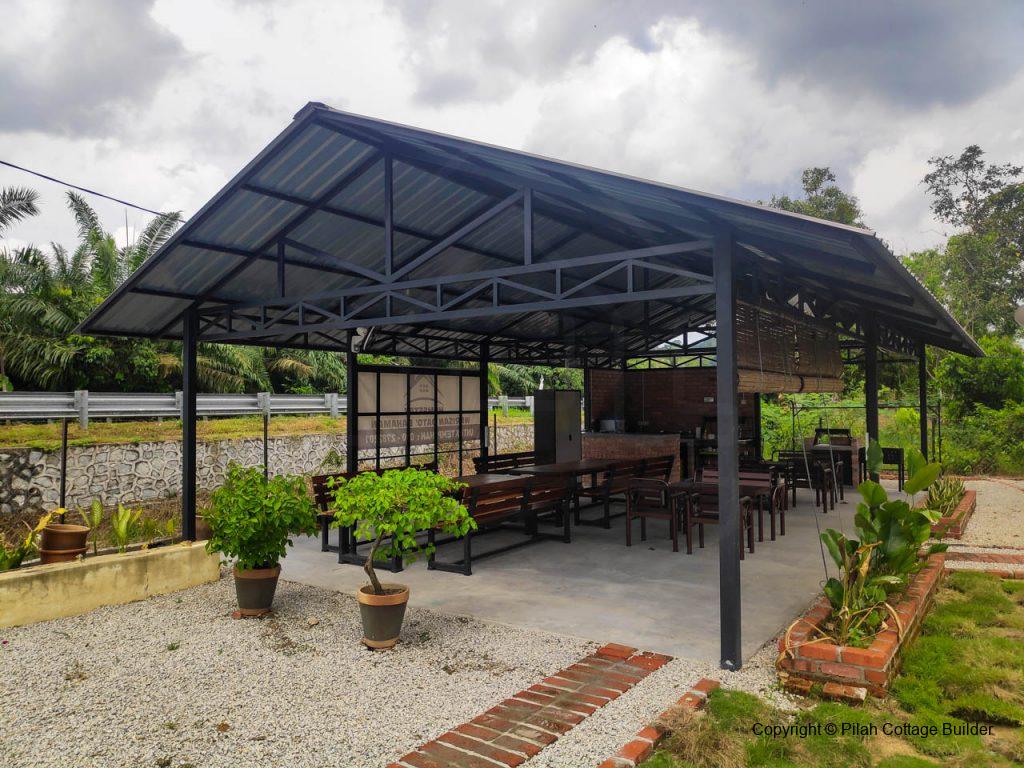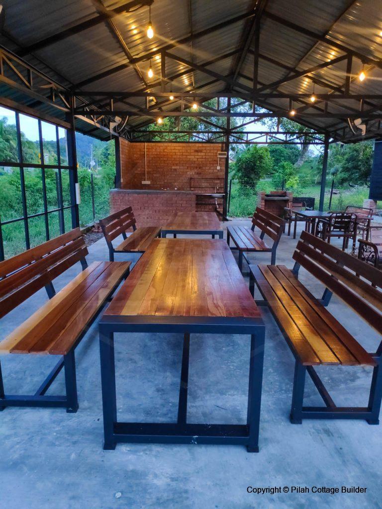 Pembinaan Cafe beserta counter memasak, mini bar dan 2 set meja makan/kerusi menggunakan kayu tempatan dan besi. Berkeluasan 20′ x 35′, cafe ini disediakan sebagai kemudahan untuk tetamu berkumpul beramai-ramai sambil bbq dan makan-makan.