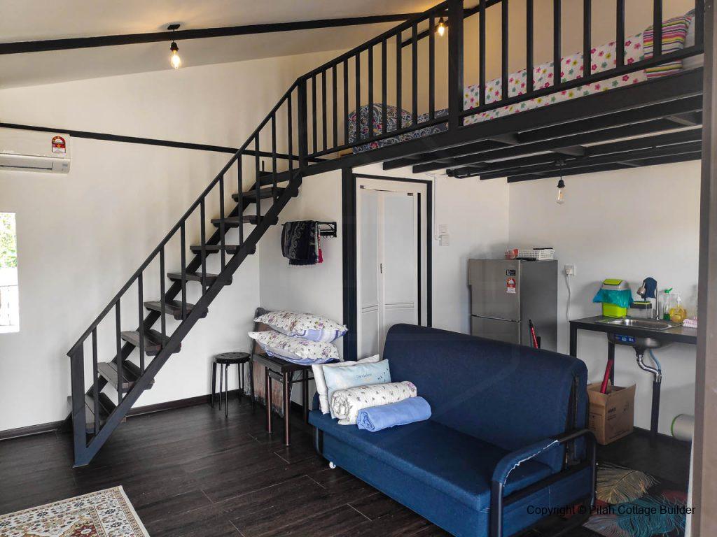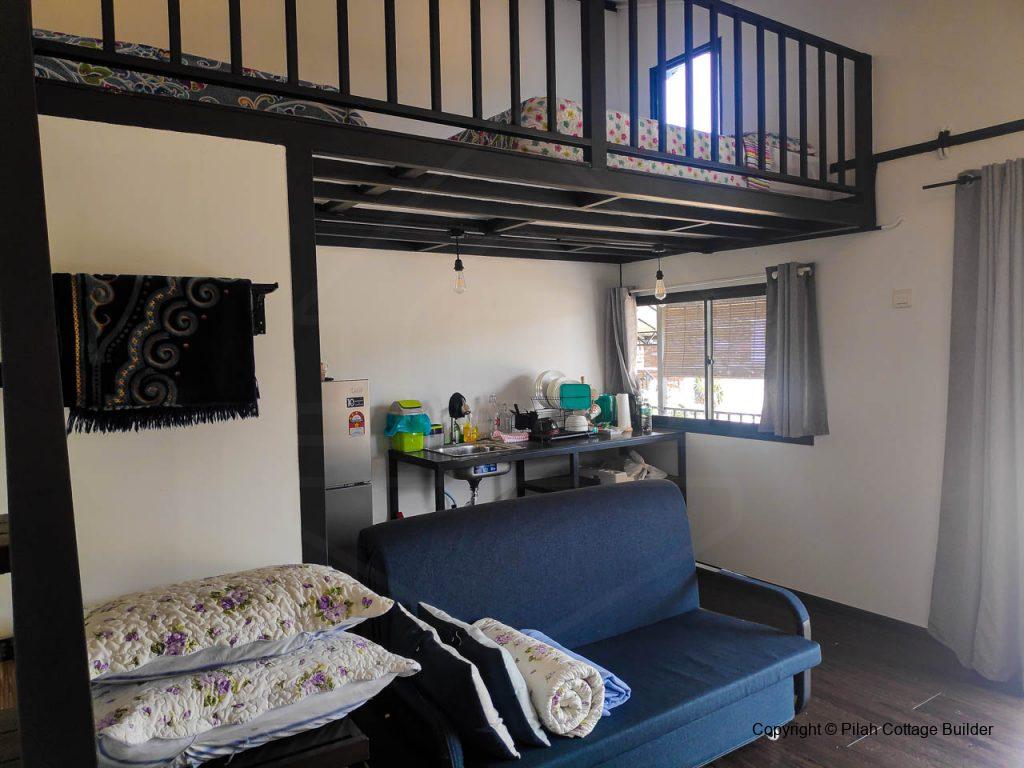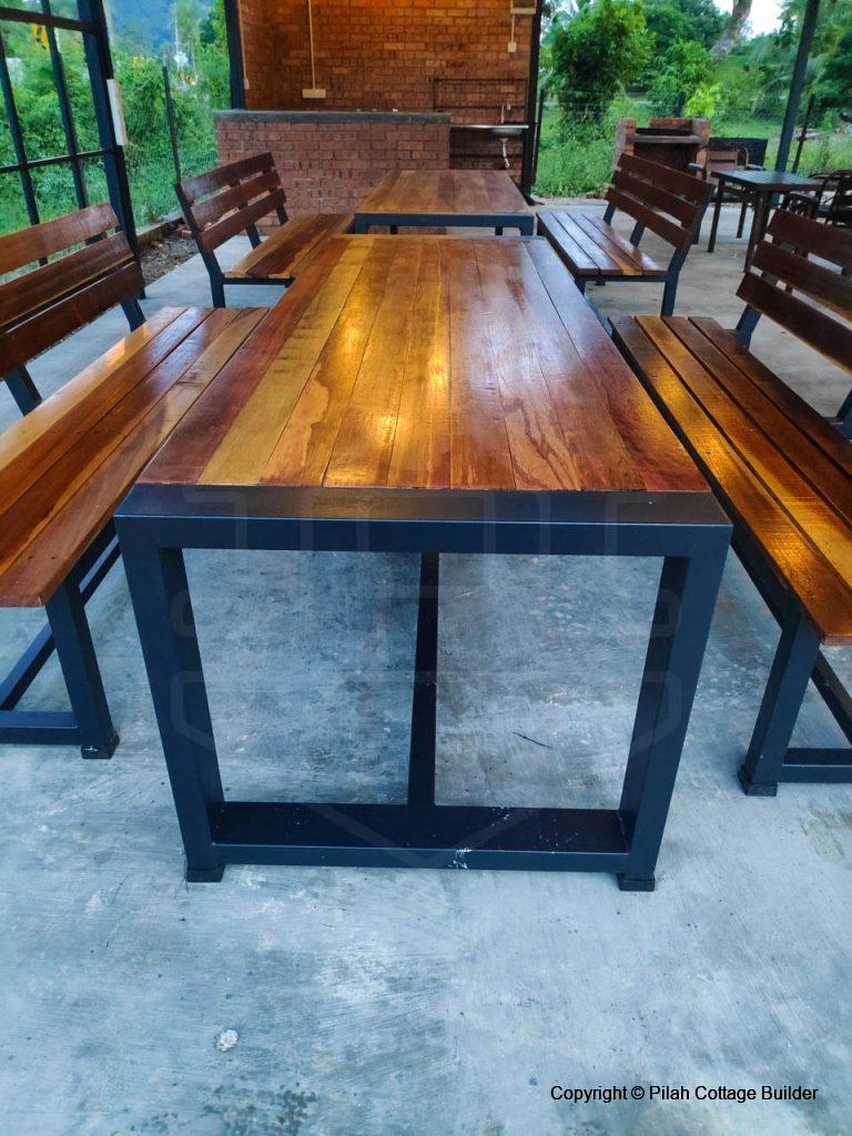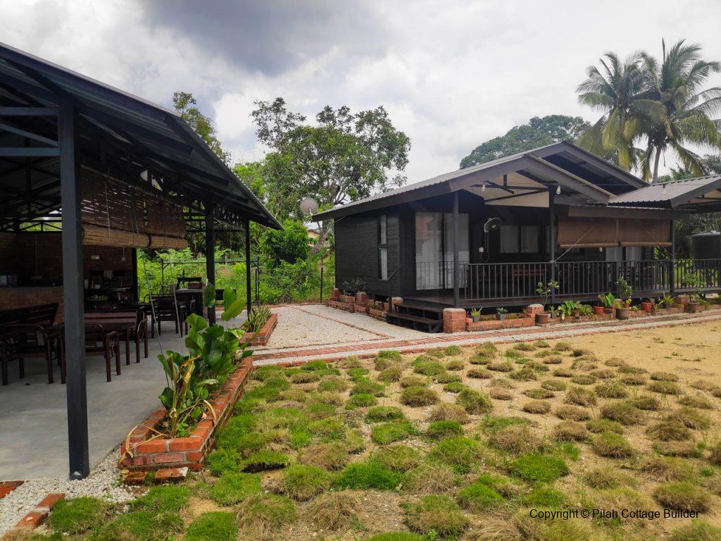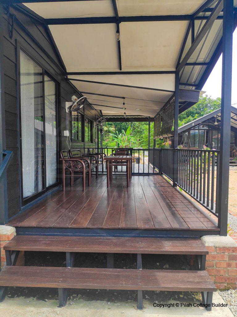 Pembinaan Cafe beserta counter memasak, mini bar dan 2 set meja makan/kerusi menggunakan kayu tempatan dan besi. Berkeluasan 20′ x 35′, cafe ini disediakan sebagai kemudahan untuk tetamu berkumpul beramai-ramai sambil bbq dan makan-makan.