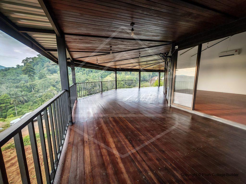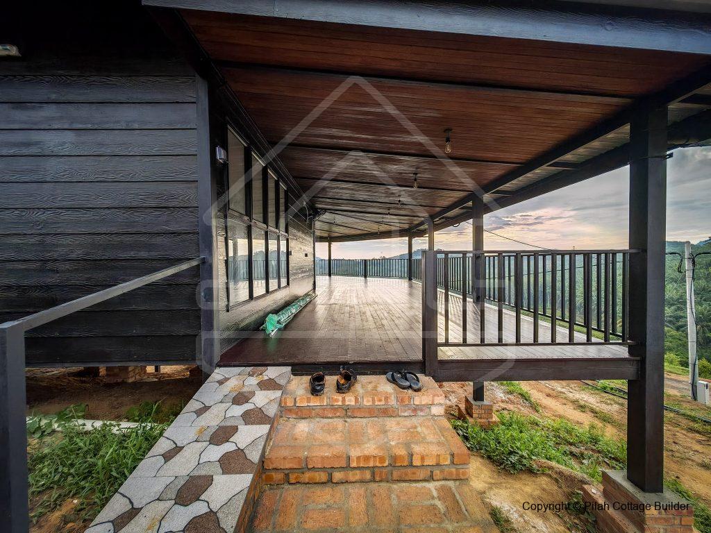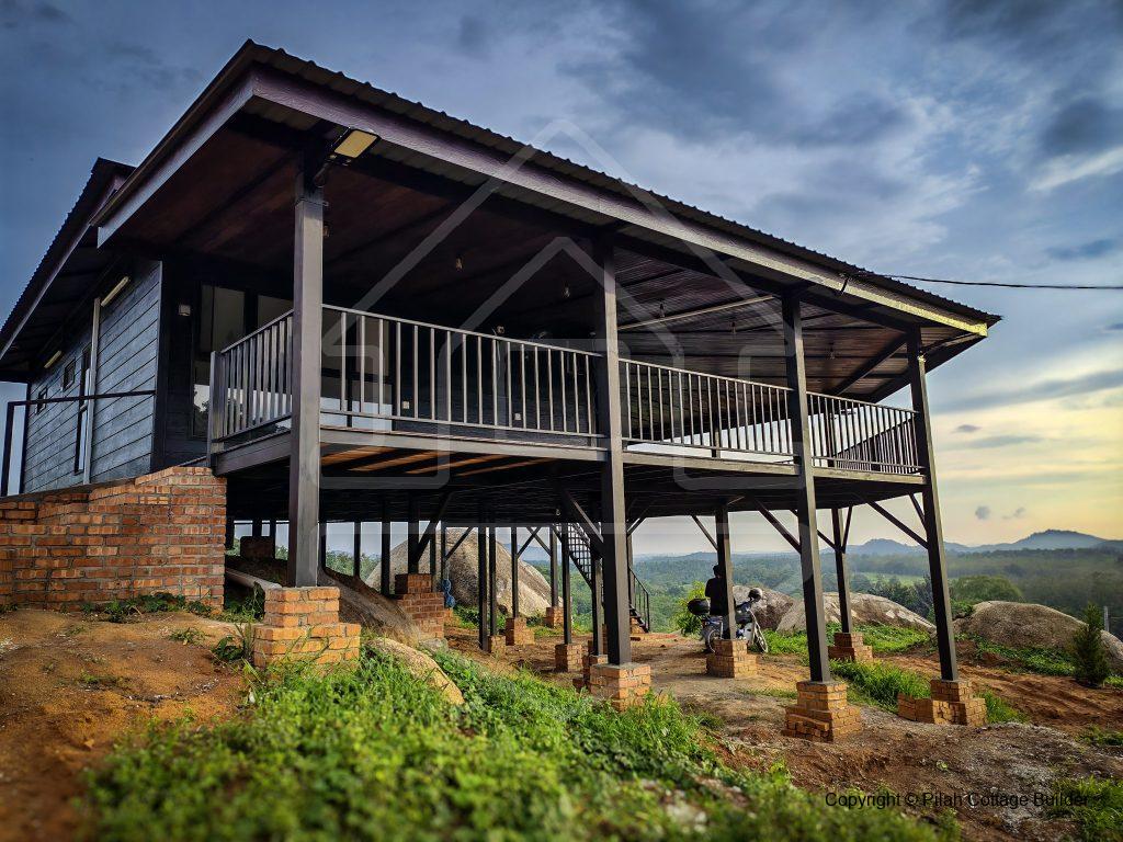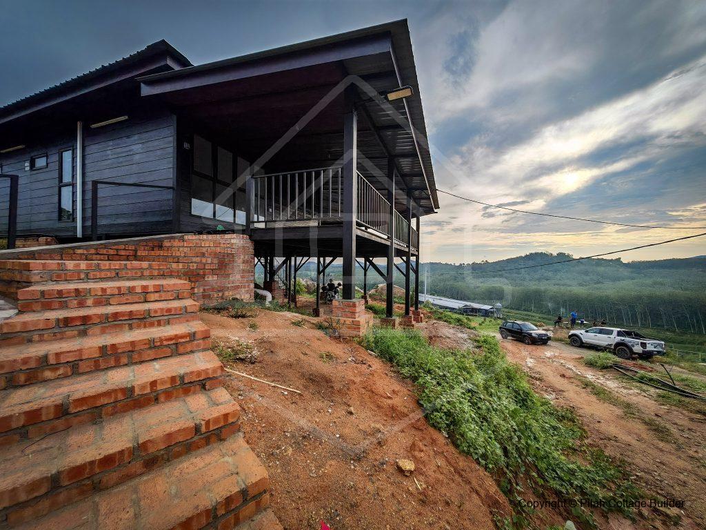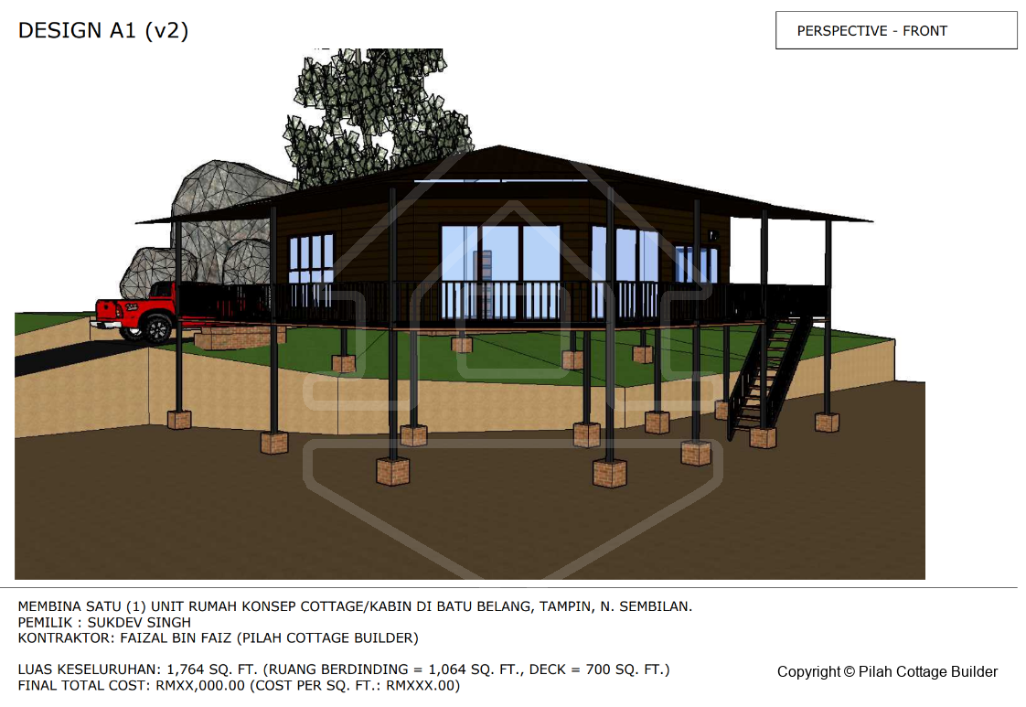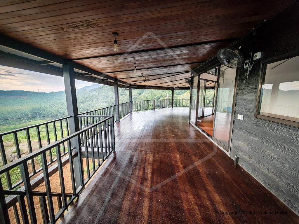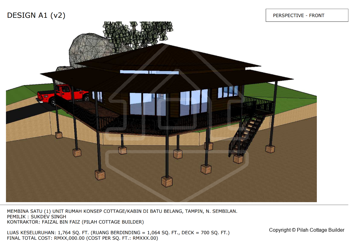 Kami membuat design yang berlainan untuk rumah ini kerana ingin memaksimumkan keluasan dan bentuk tanah yang berbatu. Keistimewaan design rumah diatas bukit ini membolehkan kami membina ruang deck/balcony yg melengkok, besar dan dapat melihat permandangan yang lebih luas. Rumah ini mempunyai 2 bilik tidur, 2 bilik air, ruang dapur dan tamu yang luas.