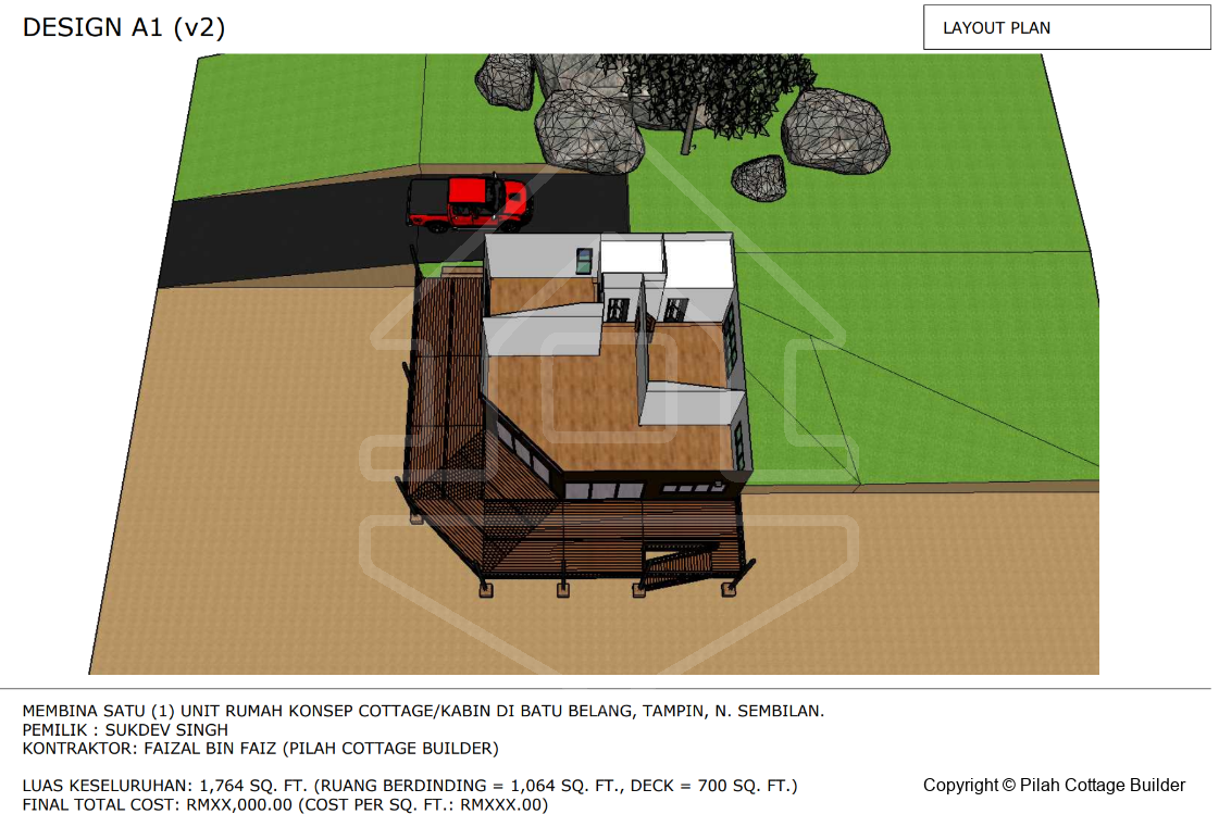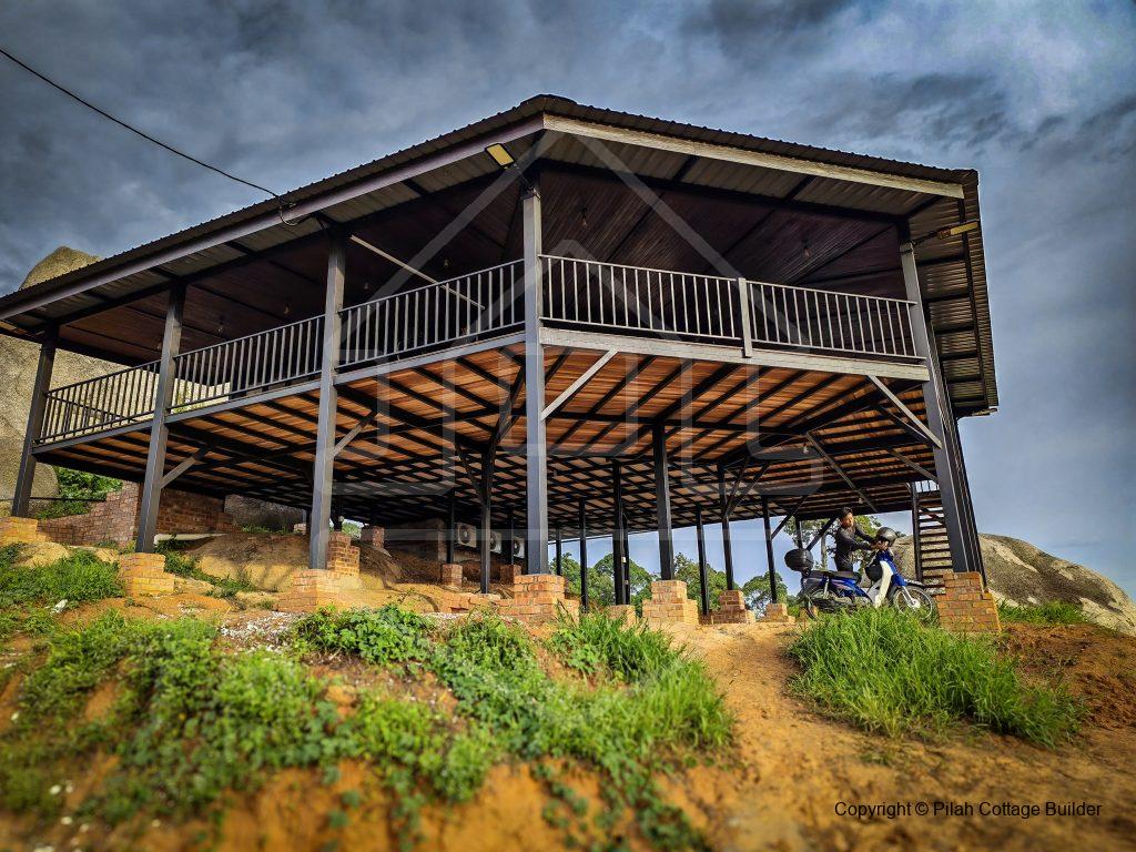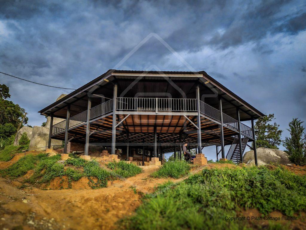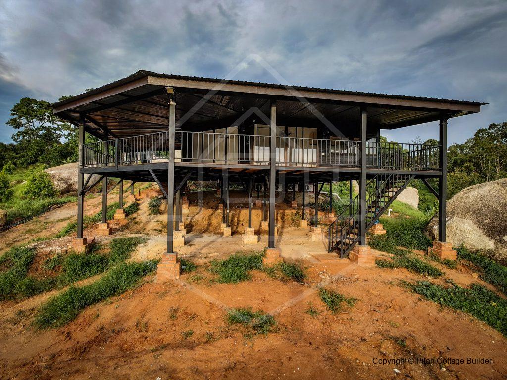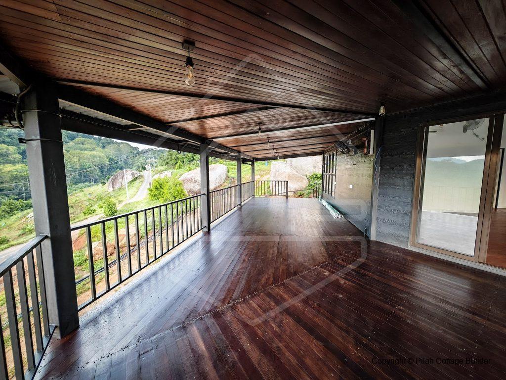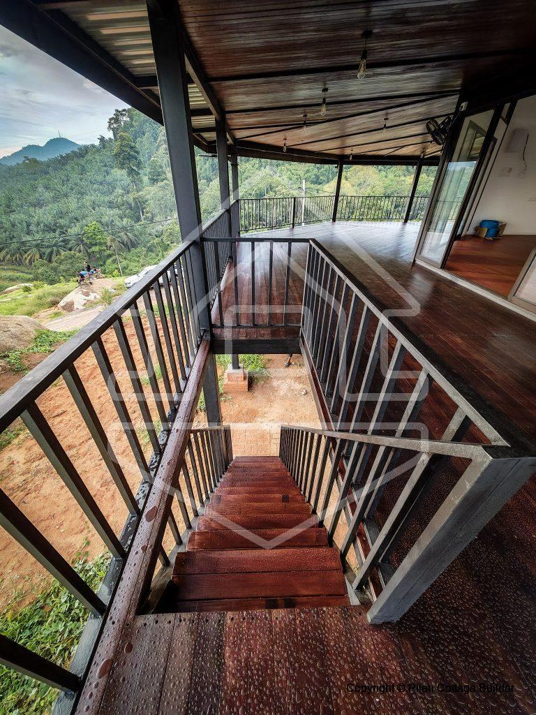 Kami membuat design yang berlainan untuk rumah ini kerana ingin memaksimumkan keluasan dan bentuk tanah yang berbatu. Keistimewaan design rumah diatas bukit ini membolehkan kami membina ruang deck/balcony yg melengkok, besar dan dapat melihat permandangan yang lebih luas. Rumah ini mempunyai 2 bilik tidur, 2 bilik air, ruang dapur dan tamu yang luas.