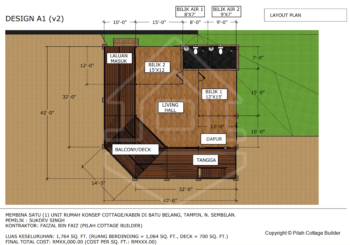 Keluasan binaan rumah: 42′ x 42′ = 1764sf